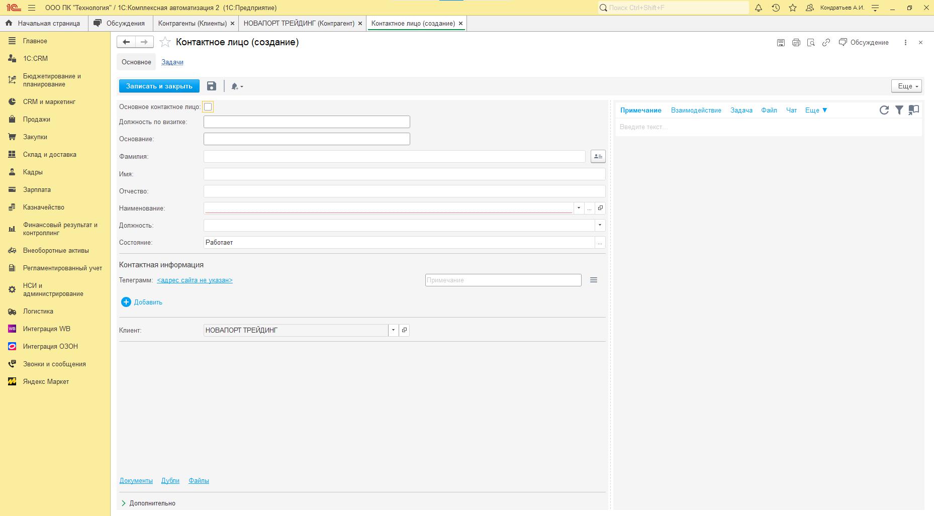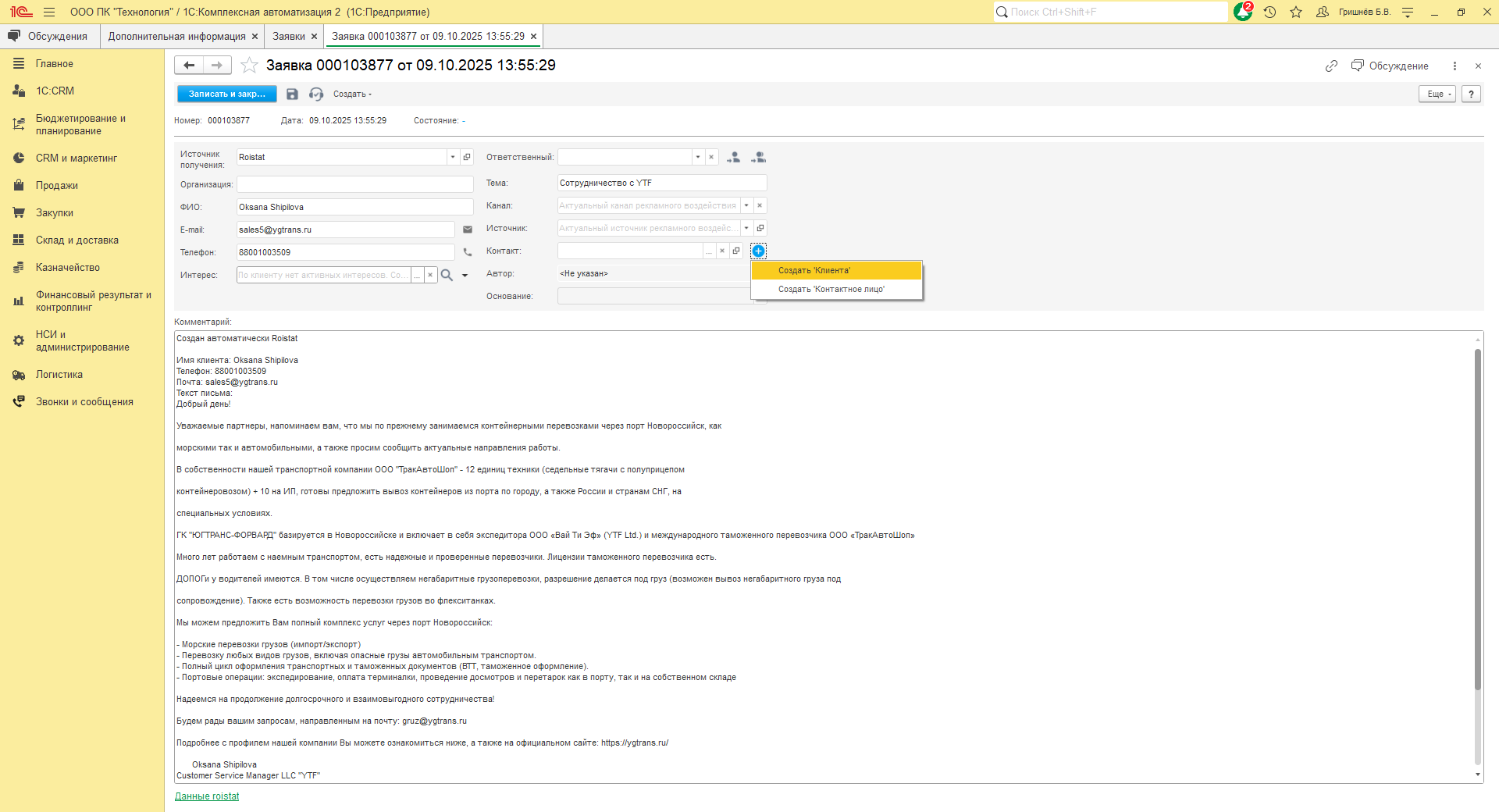 При создании заявки с новым контрагентом